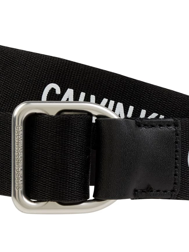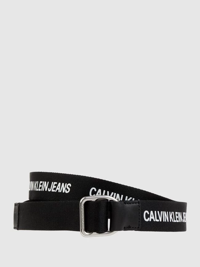 Der Gürtel von Calvin Klein Jeans ist aus Textil gefertigt. Er zeigt sich mit Logo-Muster, Metallschließe und Lederbesatz.