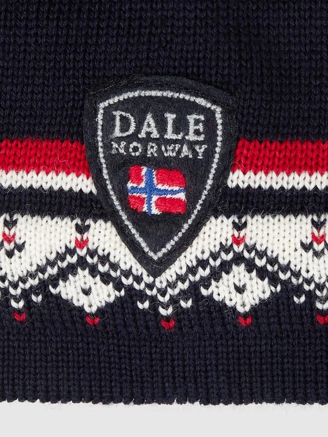 Die Beanie von Dale of Norway ist aus reiner Merinowolle gefertigt. Sie kommt mit Norweger-Dessin, Logo-Applikation und Kontrastinnenseite.