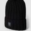 Die Beanie von HUGO ist aus einem Material-Mix mit Viskose-Anteil gefertigt. Sie zeigt sich im unifarbenen Design mit Strick-Optik, Label-Patch und Umschlag.