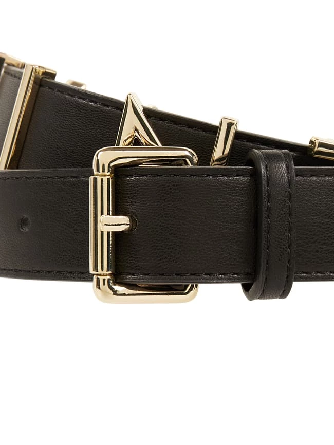 Der Gürtel von Valentino by Mario Valentino ist in Leder-Optik gehalten. Er zeigt sich mit Dornschließe und Logo in Gold-Optik.
